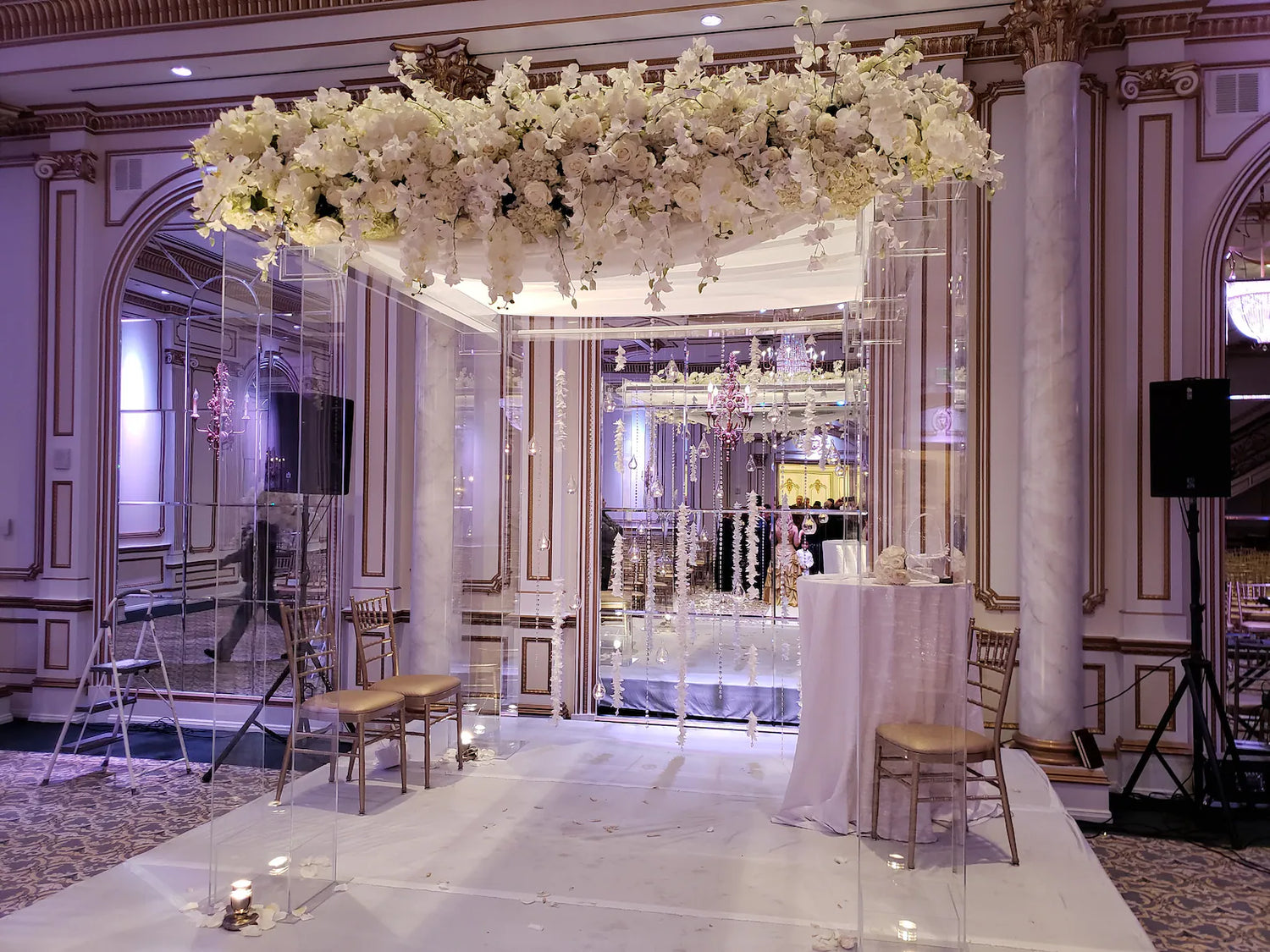 Our clear acrylic structure that brings elegance without distraction — seamlessly blending into any ballroom while creating a floating stage for florals, vows, or décor. Customizable, sophisticated, and designed to elevate the moment, not compete with it.